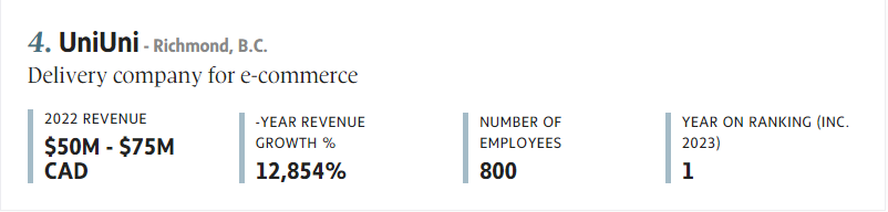 UniUni Ranks No. 4 on The Globe and Mail’s 2023 Report on Business magazine ranking of the Top Growing Companies in Canada